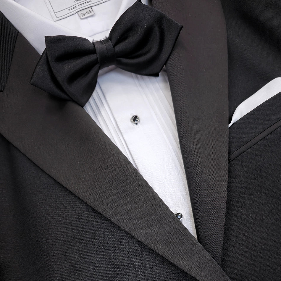 Suit everybody up for your wedding day, in a two or three piece dinner suit, accompanied with bow-tie, hankie and patent black shoes.
