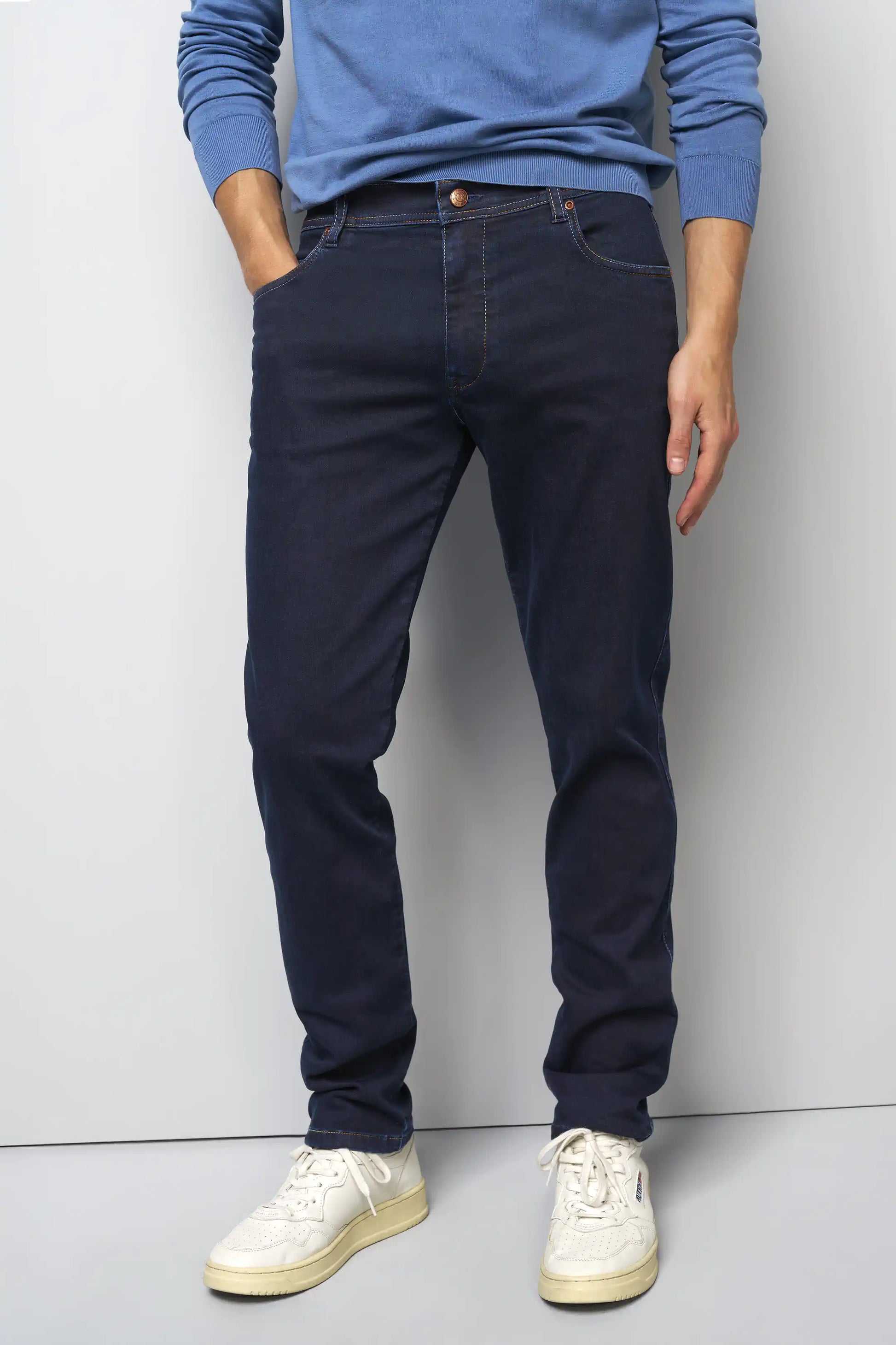 This denim in pleasantly soft organic cotton stands out with its exciting multicolour stitching. Thanks to the dark fabric, this playful detail is shown to its best advantage. In a slim fit and with individually hand-applied special effects, these denims will enhance both your business outfit and your leisure look. The super-stretch fabric provides maximum freedom of movement and the highest level of comfort. Made in a 100% climate neutral manner, FAIRLY & responsibly in our own European production facilities.
