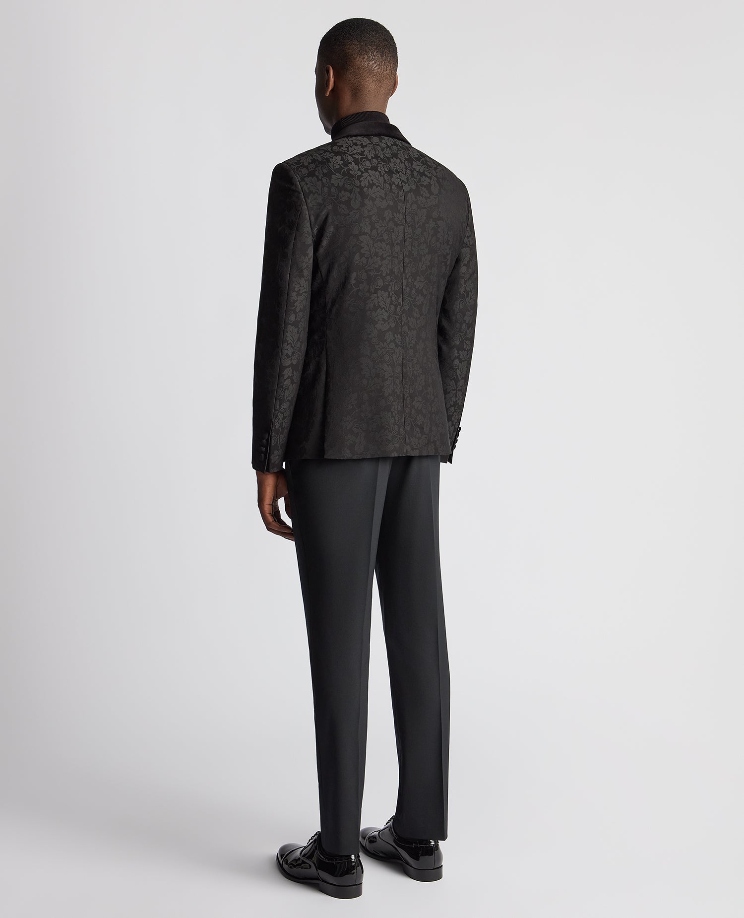 Exude timeless sophistication with this slim-fit black brocade evening jacket — a refined choice for formal occasions and special events. The intricate floral brocade fabric subtly catches the light, adding depth and texture to the design, while the contrasting black velvet shawl lapel introduces a touch of luxury.